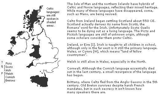 The Celts are usually divided along a linguistic boundary into two groups, the P-Celts (or Brythonic) and the Q-Celts (or Gaelic). This is because many words in some languages have the letter "p" where the other languages have "q," or a hard "c" sound.