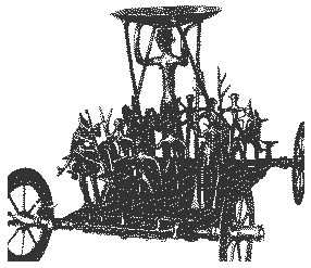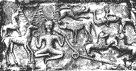 First, note the procession of warriors, wearing their jockey-cap helmets, some of which bear crests of boars or birds of prey. The horse- men use spurs and circular harness mounts. The footmen carry animal-headed war trumpets and shields.