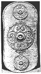 This belt hook is ornamented by a central human figure, supported by a lyre ending in a horse's head. Waterbirds swim along the margin. The arrangement might symbolise man's power over beast. [4,29]