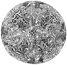 The design pictured here from the Book of Kells originally measured just one and a third inches in diameter and intertwines four beasts, eight birds, four reptiles, and four plants [3].