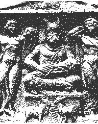 The representations of Cernunnos bear three salient features. The first is his kinship with the stag, whose antlers he wears and who sometimes appears near by. The second is the frequent association with the ram-horned snake, who merges with the god in a monument at Cirencester. The third is the symbolism of prosperity and wealth, accompanied by beasts, fruit, corn and even money. [17]